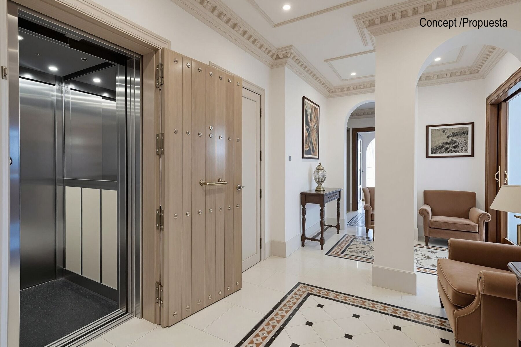 Las dos primeras plantas conforman el espacio interior principal, conectadas mediante un ascensor privado dentro de la vivienda. La planta principal cuenta con una impresionante zona de salón con techos de 3,5 metros, grandes ventanales y una chimenea que aporta calidez y carácter. Una cocina completamente equipada con electrodomésticos de alta gama, zona de invitados y amplias terrazas que rodean la vivienda completan este nivel.