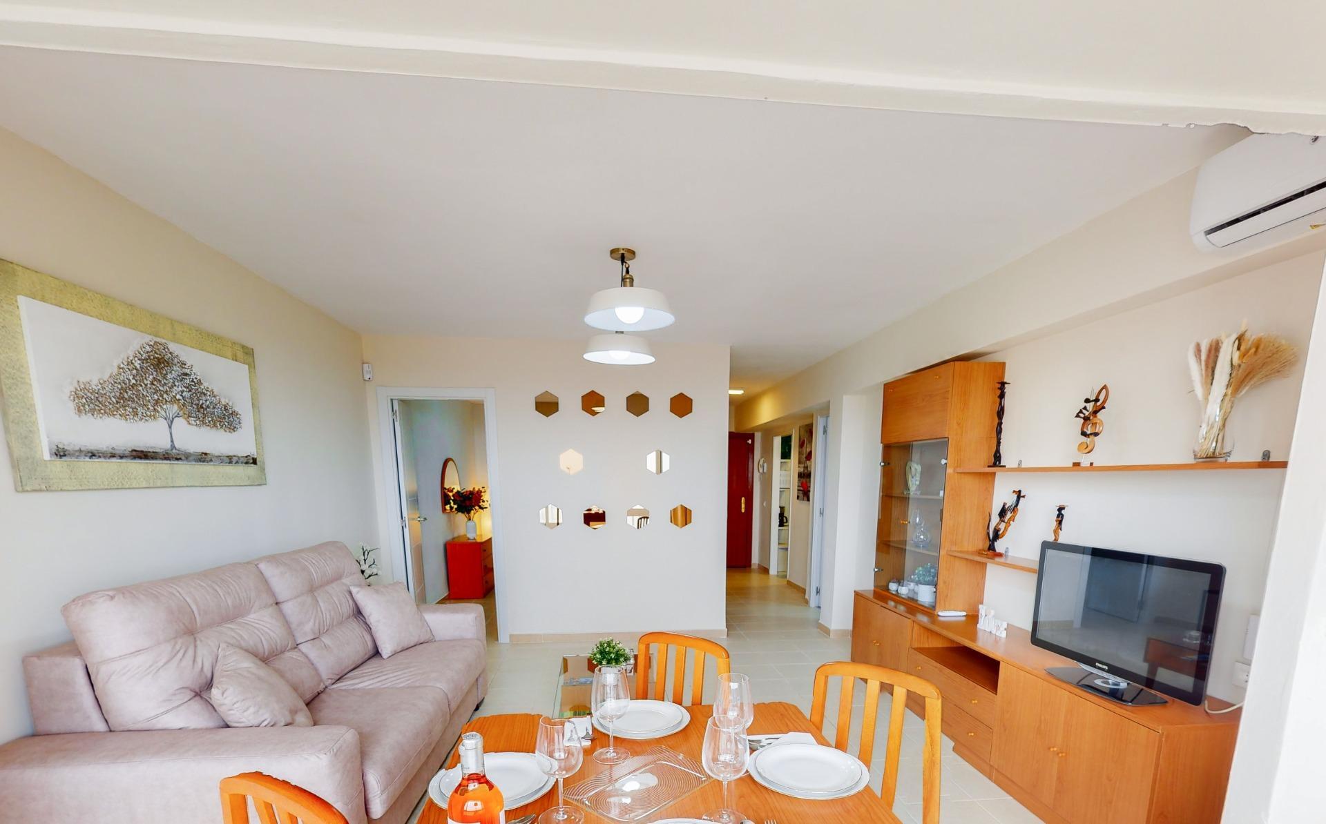 El amplio salón comedor, con vistas panorámicas al mar y una orientación sur, crea un ambiente luminoso y acogedor. Situado en la sexta planta del edificio, el apartamento ofrece impresionantes vistas despejadas que amplían la sensación de espacio.
