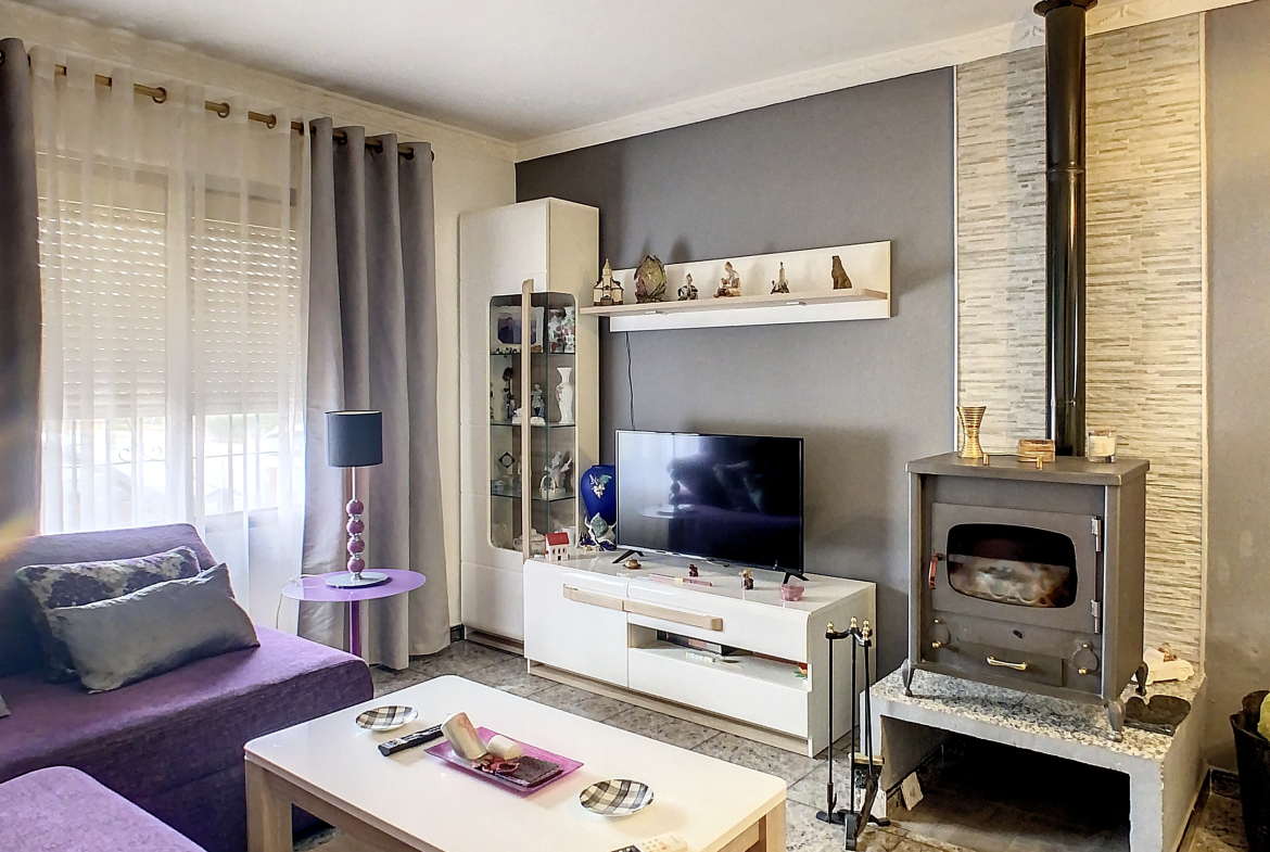 La primera vivienda se distribuye en planta baja con porche cerrado. Dispone de dos habitaciones, un luminoso salón con chimenea, cocina, y un lavadero, todo exterior.