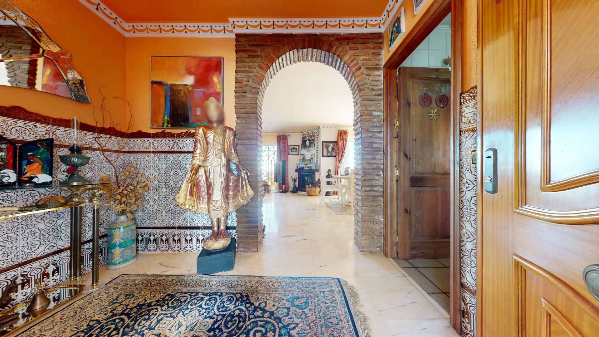 El hall de entrada, con su elegante estilo andaluz, te lleva al salón principal, un espacio luminoso y acogedor que se abre a una gran terraza. Imagina disfrutar de desayunos familiares con vistas al mar, mientras el sol ilumina cada rincón. Con suelos de mármol, chimenea y aire acondicionado, este salón es el corazón de la casa, el escenario perfecto para crear recuerdos inolvidables.