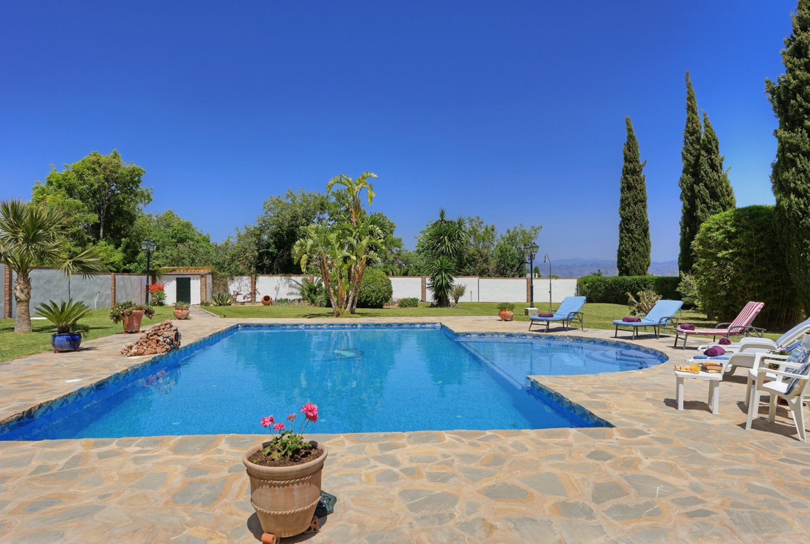 La villa cuenta con tres grandes piscinas, perfectas para disfrutar del sol mediterráneo, y pérgolas de madera que proporcionan acogedores espacios para relajarse al aire libre. Uno de los puntos de esta villa es un gran mirador, desde el cual se puede disfrutar de las zonas ajardinadas, piscinas, y de unas vistas despejadas que abarca la inmensidad de las montañas y el campo, un auténtico lujo. Además, dispone de cenadores ideales para disfrutar de cenas al aire libre con vistas a los jardines.