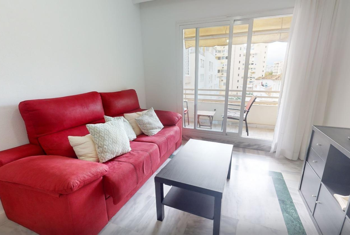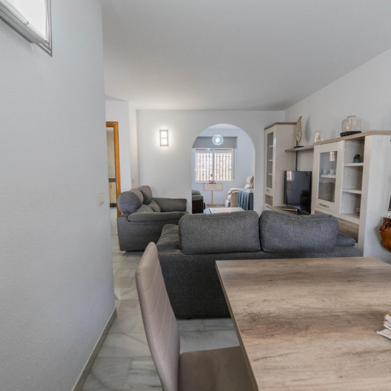 Salón luminoso con acceso directo a una encantadora terraza, ideal para relajarse y disfrutar del clima de la Costa del Sol.