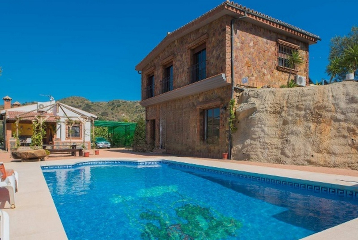 La finca es perfecta para disfrutar de la piscina y del soleado clima de Málaga. Esta vivienda se encuentra en un entorno natural, con bellas vistas al valle de Álora y una multitud de olivos y otros árboles en la parcela.